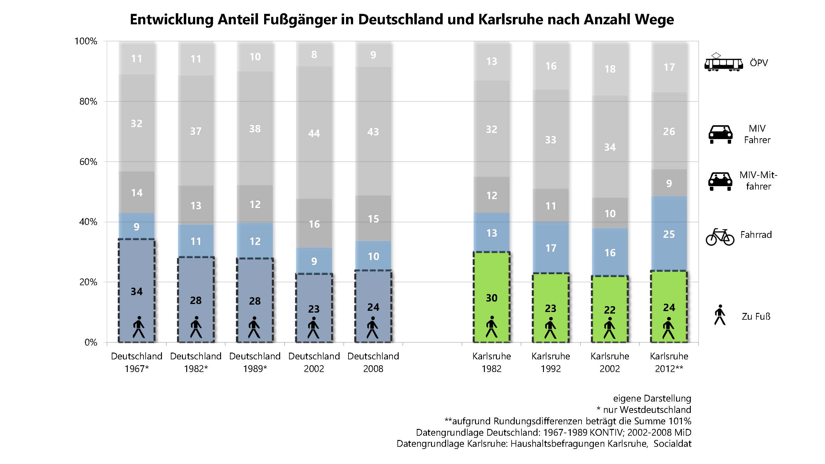 Wie viele Wege werden zu Fuß zurückgelegt? So haben sich die Anteile im Fußgängerverkehr in Deutschland und Karlsruhe entwickelt! Entwicklung Anteile im Fußgängerverkehr