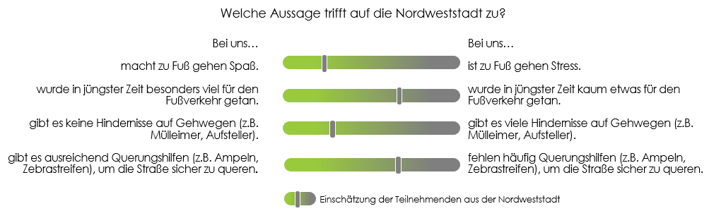 Die Möglichkeit, mittels eines Fragebogens Rückmeldung zum Fußverkehr in der Nordweststadt zu geben, wurde rege genutzt. Hierbei wurden u.a. Konflikte mit dem Rad- und Autoverkehr genannt sowie fehlende Zebrastreifen bemängelt. Zudem wurde der Wunsch geäußert, in der Wilhelm-Hausenstein-Allee aufgrund der anliegenden Einrichtungen (Schulen, Kita, Altenwohnheim) eine Tempo-30-Zone zu errichten.