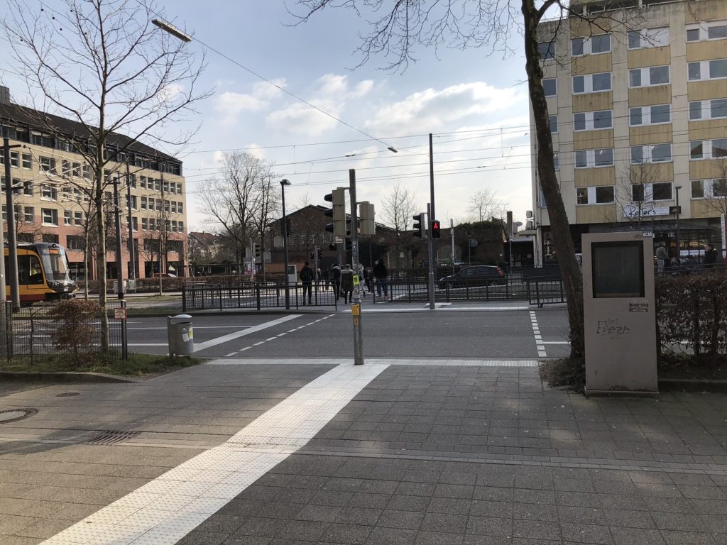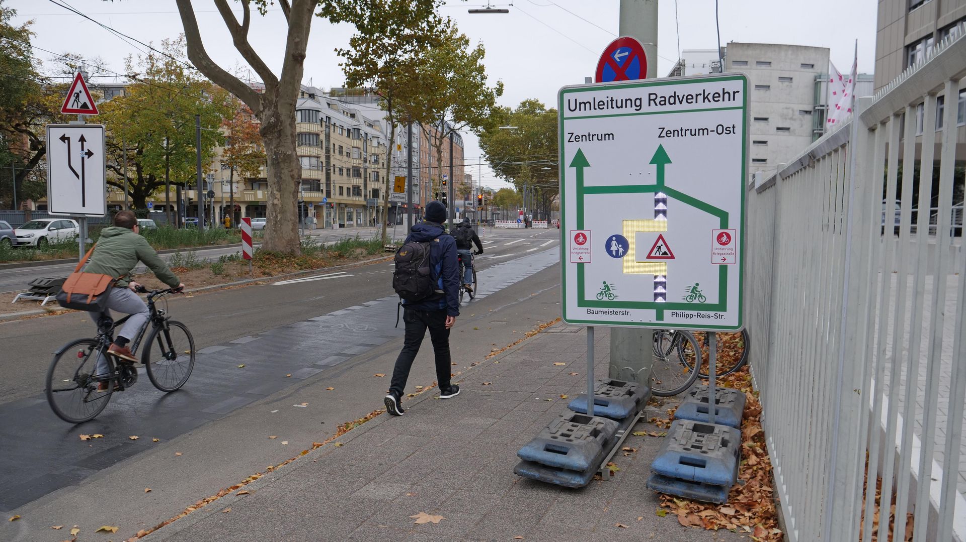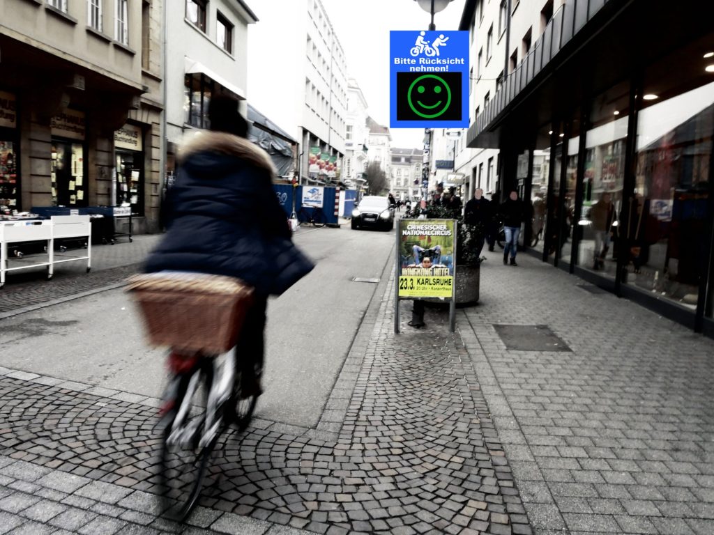 Um die Situation im Baustellenbereich am Mendelssohnplatz für zu Fuß Gehende sowie für Radfahrende zu entschärfen und erträglicher zu machen, werden dynamische Umleitungsschilder für Radfahrer zur Umfahrung der Kriegsstraße eingesetzt. Radfahrer, die aus der Rüppurrer Straße beziehungsweise der Fritz-Erler-Straße kommen, über die Displays in Echtzeit über das Verkehrsaufkommen an den Gehwegen und Straßenquerungen rund um den Baustellenbereich informiert. Sie können so besser entscheiden, ob sie die empfohlene Umleitungsroute nutzen oder absteigen und ihr Rad durch die Baustelle schieben.